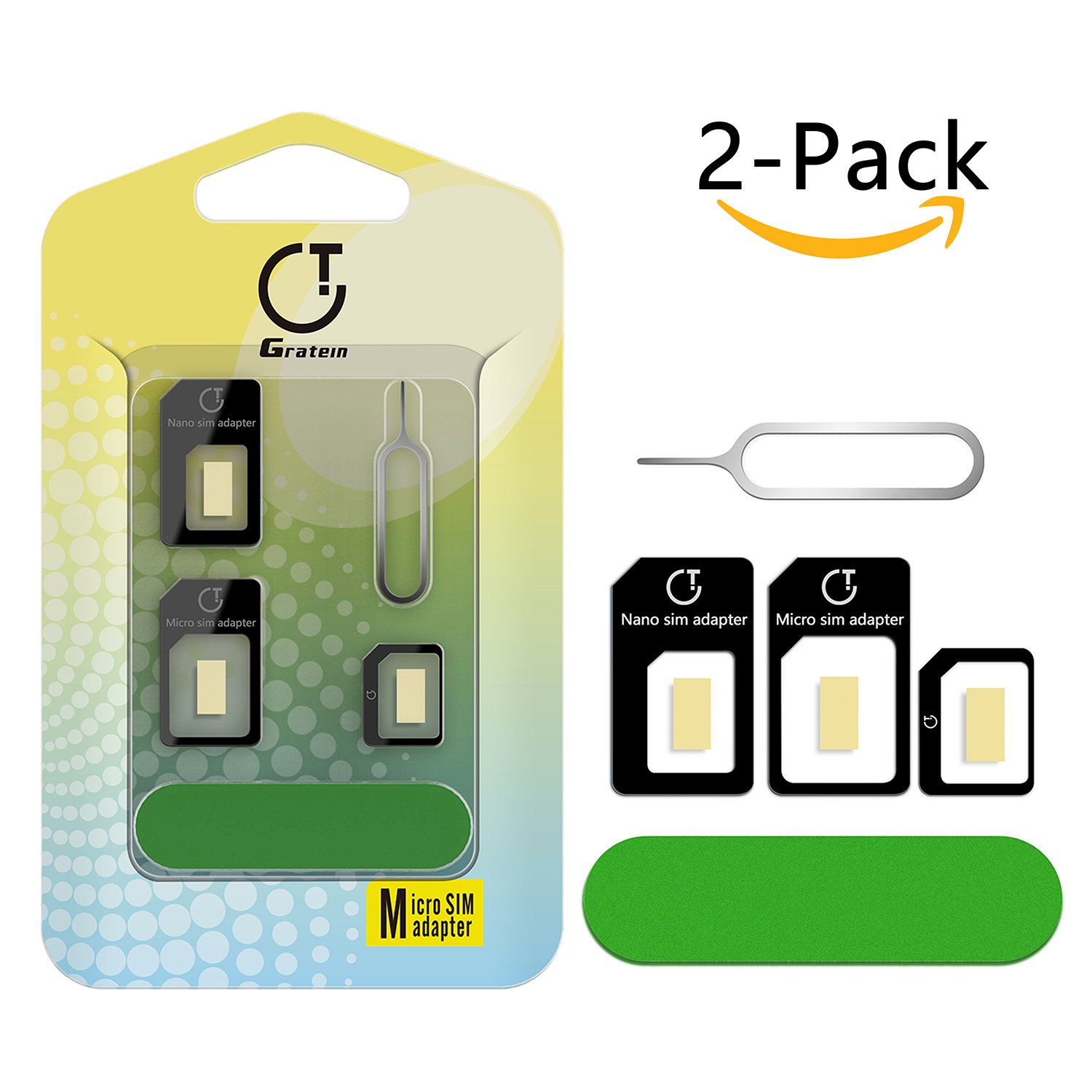 Adattatore Sim Card, Gratein 2 Pezzi Adattatore Kit Convertitore 5 in 1 per Carte SIM (Nano Micro Standard) con Sander Bar e Vassoio Aperta Ago (Nero) specificazione
