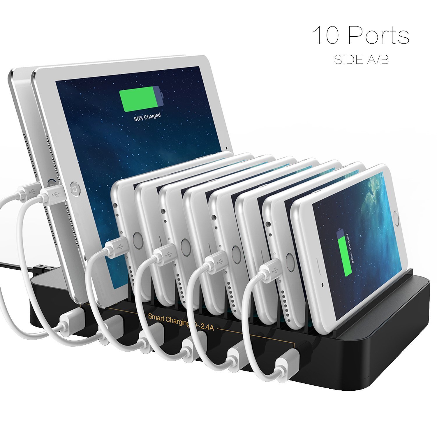 10 porte, Potente postazione da 60W: 4 porte di ricarica (4x1A) con cavo retrattile incluso sul lato A, 6 porte di ricarica Smart USB (0~2.4A) sul lato B. Permette di caricare simultaneamente fino a 10 dispositivi fra cui smartphone e tablet in uno spazio ridotto.